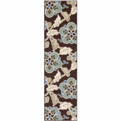 Introducing our stunning area rug, sized at a practical 2-3 by 8-0 feet and perfect for those hard-to-decorate spaces. This chocolate and aqua runner features a charming floral pattern in a timeless country style, adding a touch of elegance to any room. Crafted in Turkey using a power loomed technique, this rug is constructed with 87 percent polypropylene, 9.3 percent polyester, and 3.7 percent latex, offering a soft yet durable finish. With a convenient height of 1/8 inch, it nestles seamlessly into your decor without creating an obstacle. Enhance your home with this delightful piece that blends style with functionality. Whether placed in a hallway or along a kitchen path, this runner makes a statement, transforming any space with its inviting colors and intricate design.